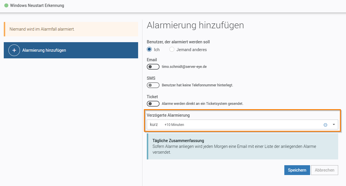 Beachte: Der Maximalwert für die verzögerte Alarmierung entspricht 43.200 Minuten (30 Tage).