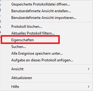 Abhilfe schafft hier eine Vergrößerung des Speichers für das Windows Ereignisprotokoll: