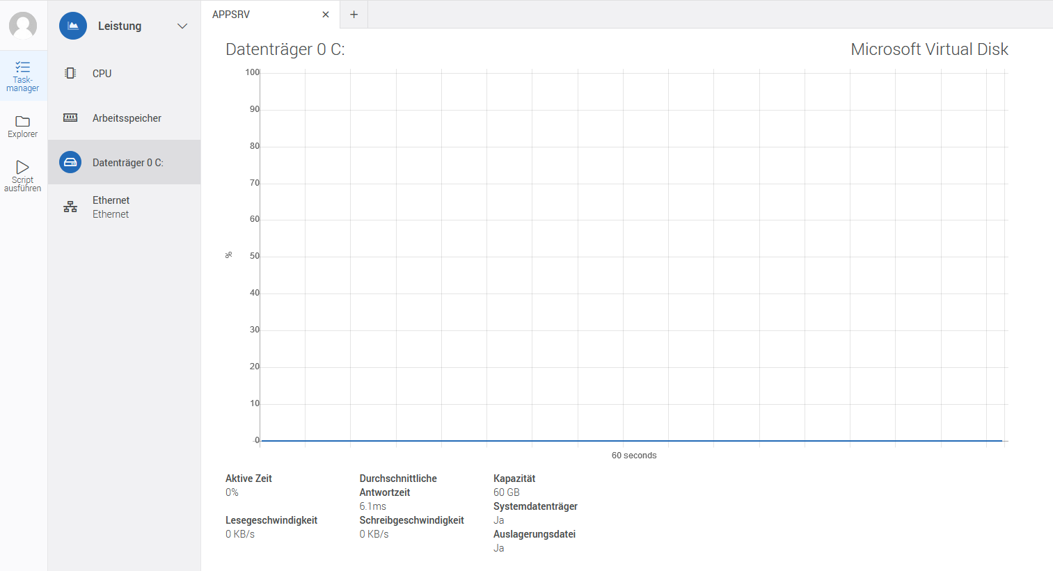 Der Live Taskmanager ist eine Umsetzung des Windows Taskmanager und fungiert als Tool zur direkten Analyse und möglichen Behebung von Problemen auf Systemen. Über den Live Taskmanager haben wir einen Überblick über CPU, Auslastung, RAM, Festplatten und Ethernet.