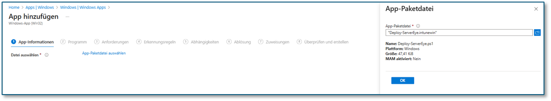 Jetzt App-Paketdatei auswählen, unsere Deploy-ServerEye.intunewin Datei auswählen und auf OK: