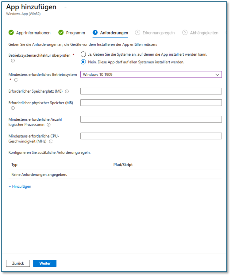 Hier das Pflichtfeld „Mindestens erforderliches Betriebssystem“ auswählen und auf weiter: