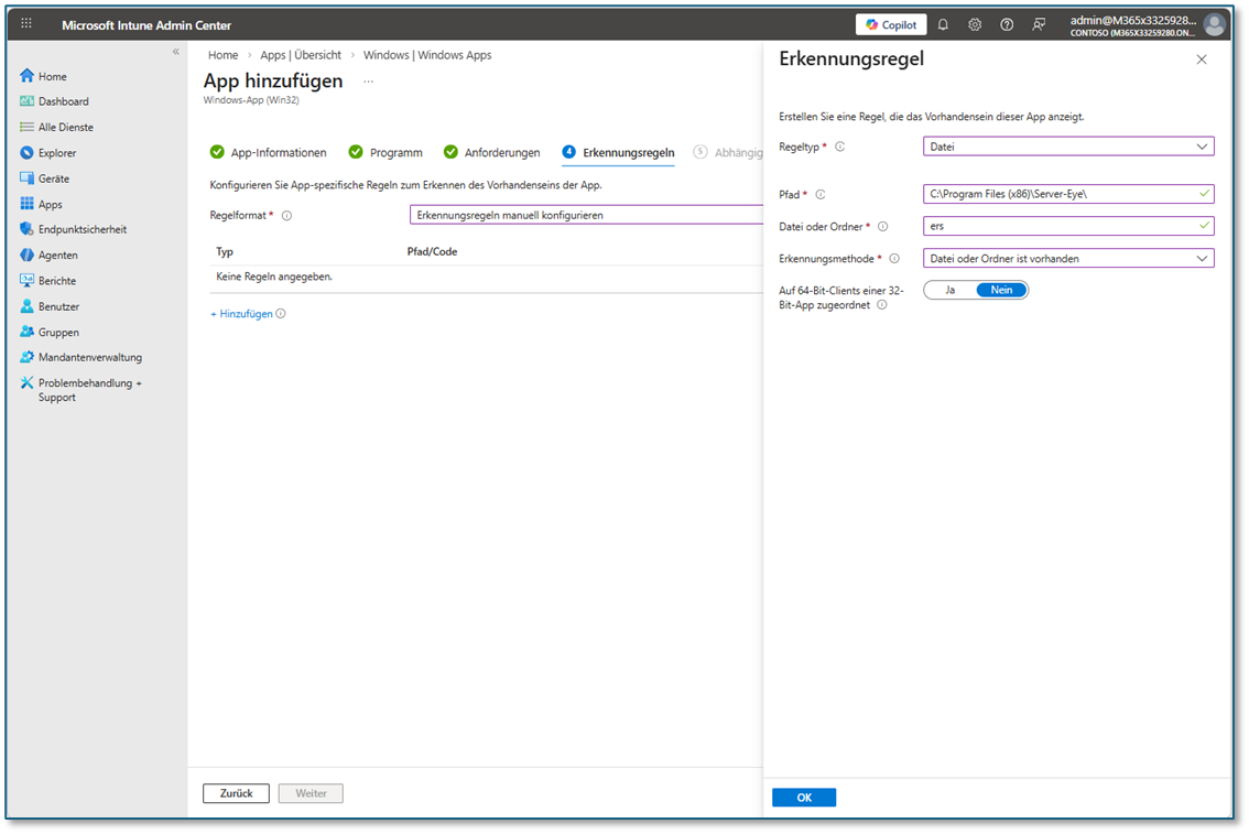 "und wo sage ich, dass wenn der Ordner da ist nicht installieren, wenn er fehlt installieren" Sehr gute Nachfrage – das ist ein wichtiger Punkt, den man in Intune verstehen muss: Du sagst das nicht direkt in Intune. Die Logik „Wenn Ordner da → nicht installieren, wenn Ordner fehlt → installieren“ wird automatisch durch die Detection Rule abgebildet. Erklärung: