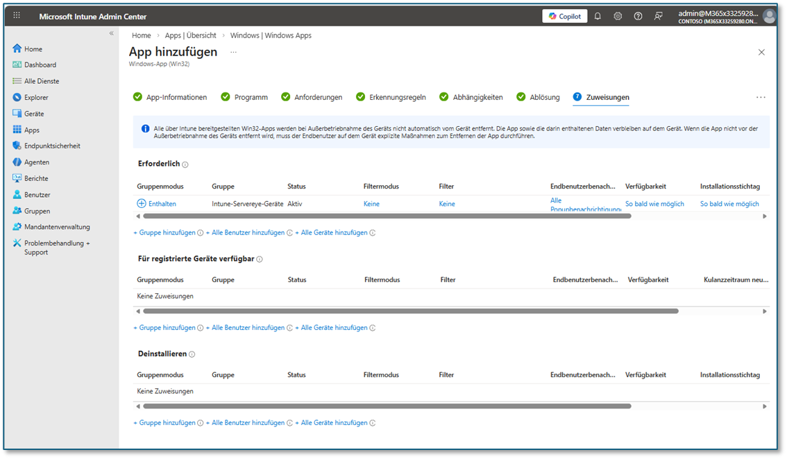 Das PowerShell-Skript lässt sich einfach mit dem "Microsoft Win32 Content Prep Tool" in eine .INTUNEWIN-Datei umwandeln und damit lässt sich eine App für Intune generieren. Sobald die App auf dem im Link vorgezeigten Weg generiert wurde, kann sie bei jedem Kunden eingefügt werden über Intune: