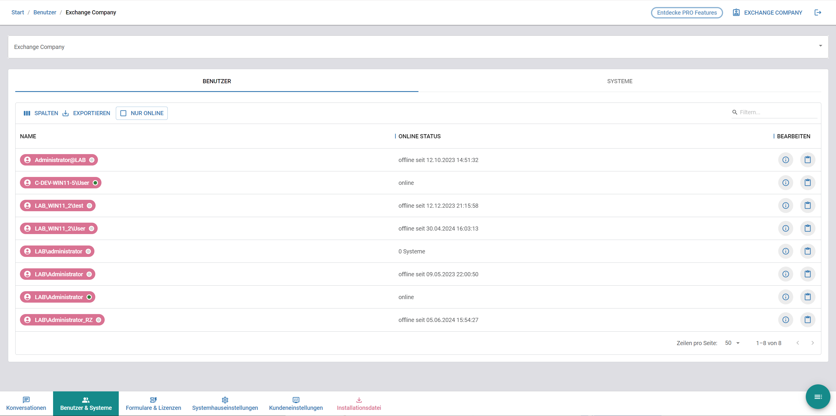 Bei Klick auf den Footer-Navigationspunkt "Benutzer & Systeme" wird die Liste der Benutzer eines Kunden geladen. Ist noch kein Kunde gewählt, muss in der Kunden-Selectbox ein Eintrag ausgewählt werden. Es öffnet sich die Liste aller Benutzer des Kunden, die einen Fast Contact Client installiert haben. Der aktuelle Online-Status des jeweiligen Benutzers wird direkt am Benutzernamen durch einen grünen ("Nutzer ist online") oder grauen ("Nutzer ist nicht online") Kreis symbolisiert. Die Spalte "Online Status" zeigt detaillierte Informationen zum letzten Online-Zeitpunkt an.