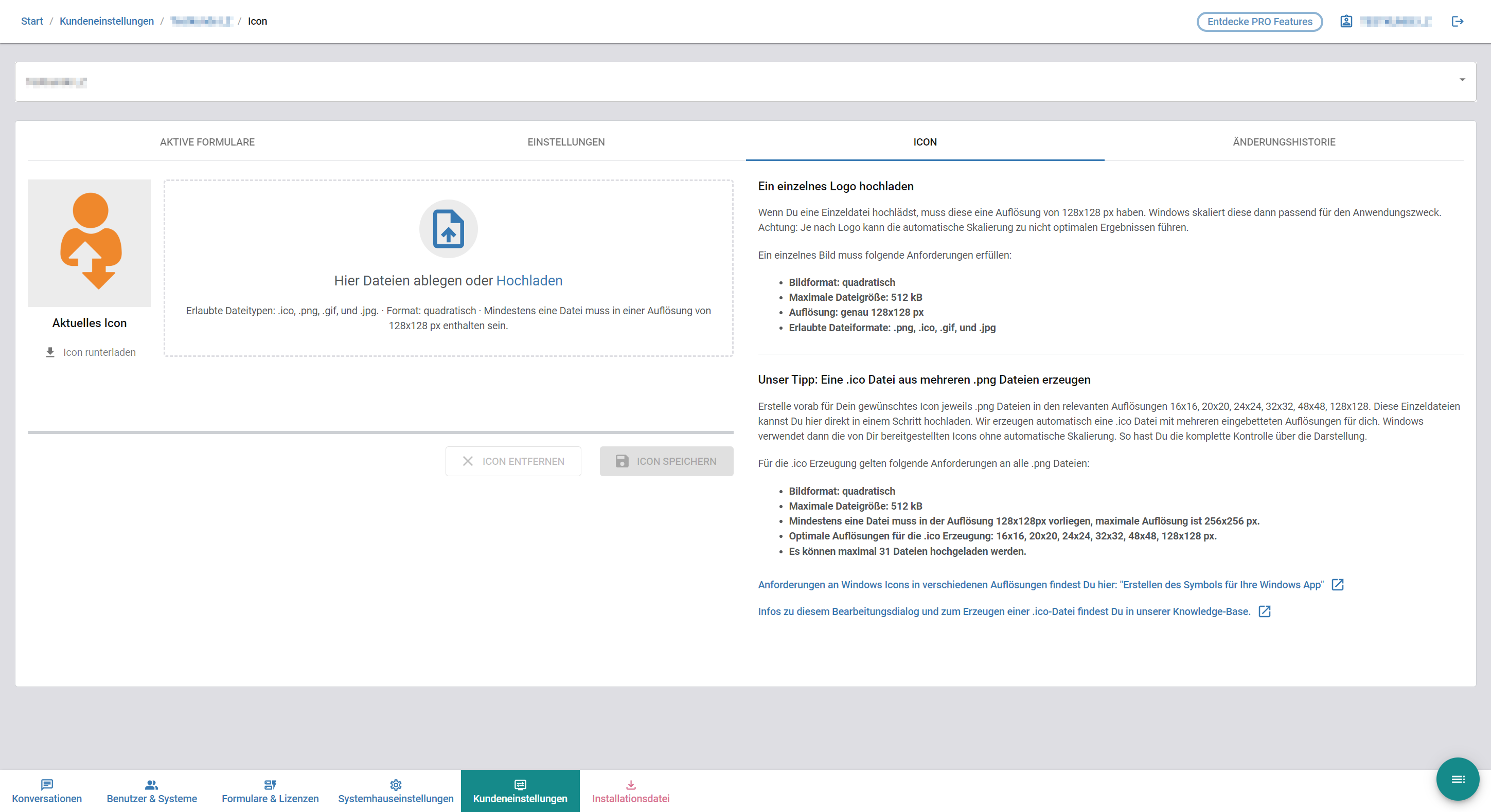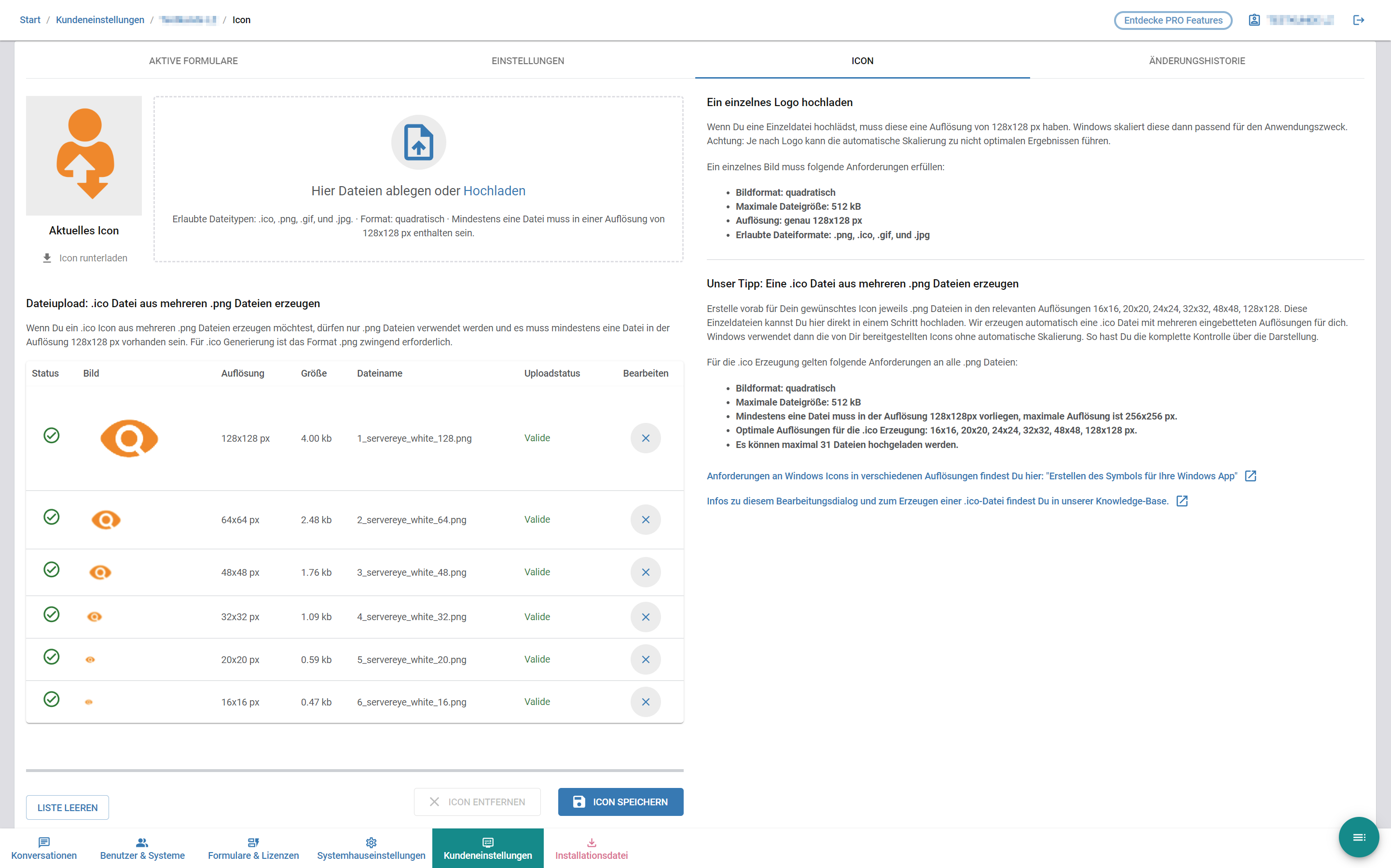 Mit Klick auf den Footer-Navigationspunkt "Kundeneinstellungen" bzw. "Systemhauseinstellungen" und Wechsel auf den Tab "Icon" sind die Fast Contact Icon-Einstellungen (global oder pro Kunde) zugänglich.