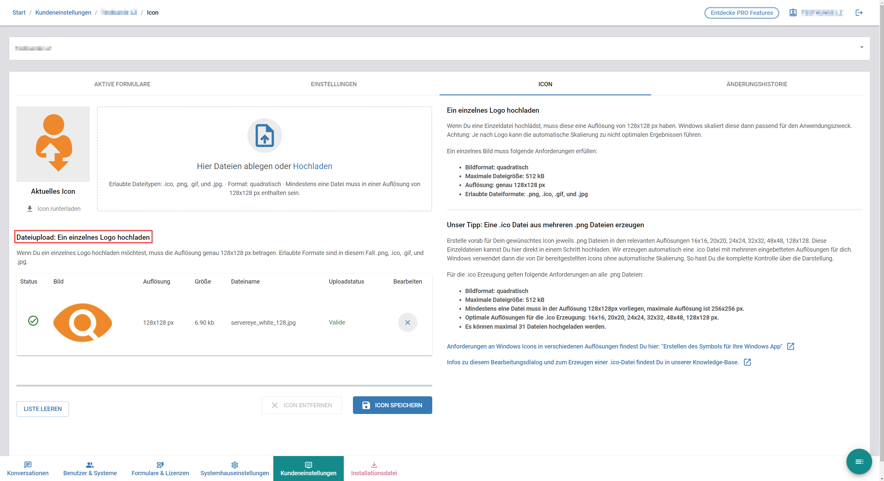 Wird eine Einzeldatei ausgewählt, die den Anforderungen entspricht, so wird dies mit dem Hinweis "Dateiupload: Ein einzelnes Logo hochladen" visualisiert und der Button "Icon speichern" wird aktiv.
