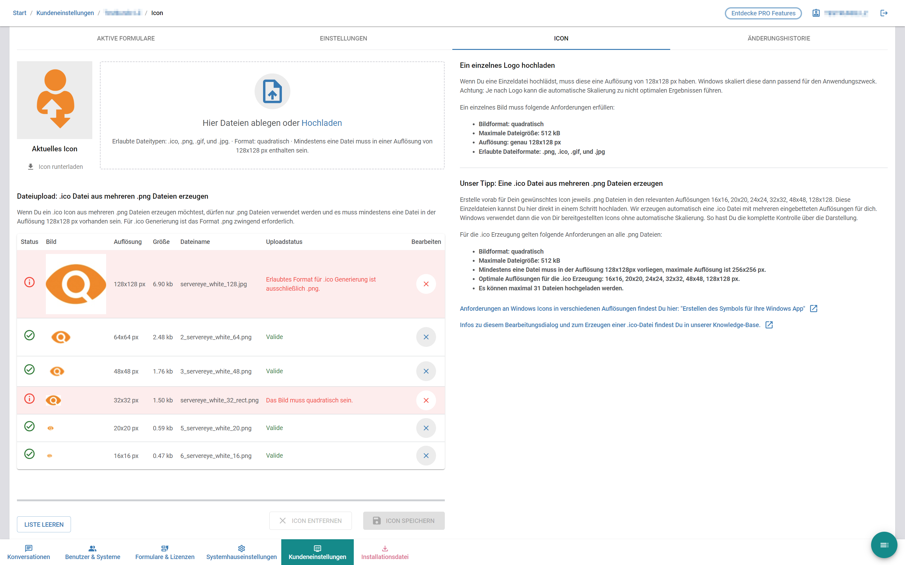 Der Menüpunkt bietet auf der linken Seite die Anzeige des aktuell hinterlegten Icons mit Download-Möglichkeit und eine Upload-Option per Auswahl oder Drag'n'drop. Mit dem Button "Icon speichern" werden die ausgewählten Icon-Dateien hochgeladen und gespeichert. Auf der rechten Seite sind Instruktionen zur Nutzung verfügbar.