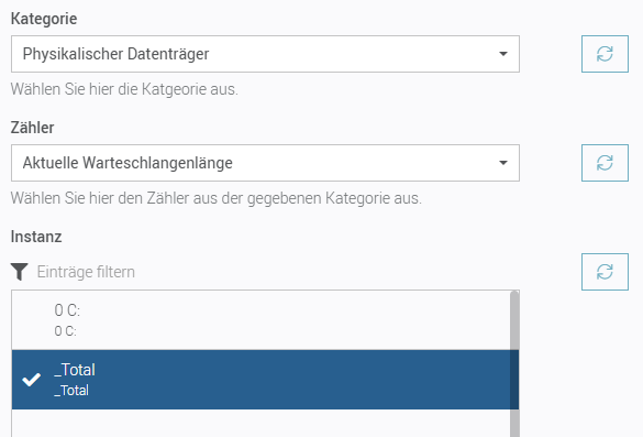 5. Instanz Einstellungen setzen:_Total ist dabei ein Durchschnittswert über alle verfügbaren Instanzen. Nicht alle Zähler haben dabei eine Instanz oder einen anderen Wert als _Total. Es können hier auch mehrere Instanzen ausgewählt werden.
