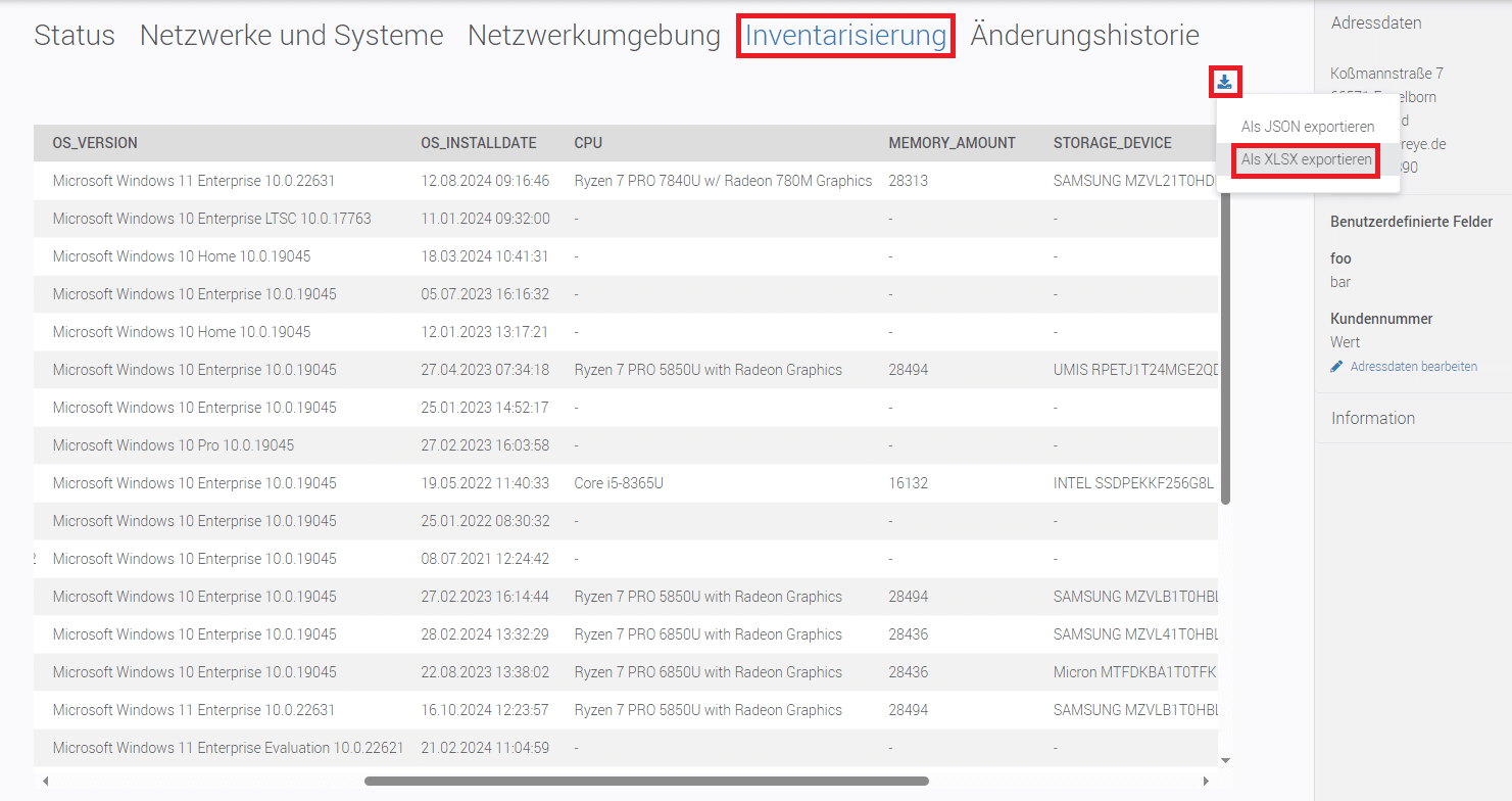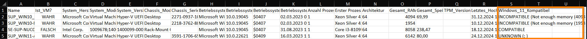 In der XLSX-Datei sind folgende Spalten vorhanden: Name, Ist_VM?, System_Hersteller, System_Modell, System_Version, Chassis_Modell, Chassis_Seriennummer, Betriebssystem, Betriebssystem_Version, Betriebssystem_Sprache, Betriebssystem_Installationsdatum, Anzahl Prozessoren, Erster Prozessor, Architektur, Gesamt_RAM, Gesamt_Speicherkapazität_MB, TPM_Version, Letztes_Hochfahren, Windows_11_Kompatibel