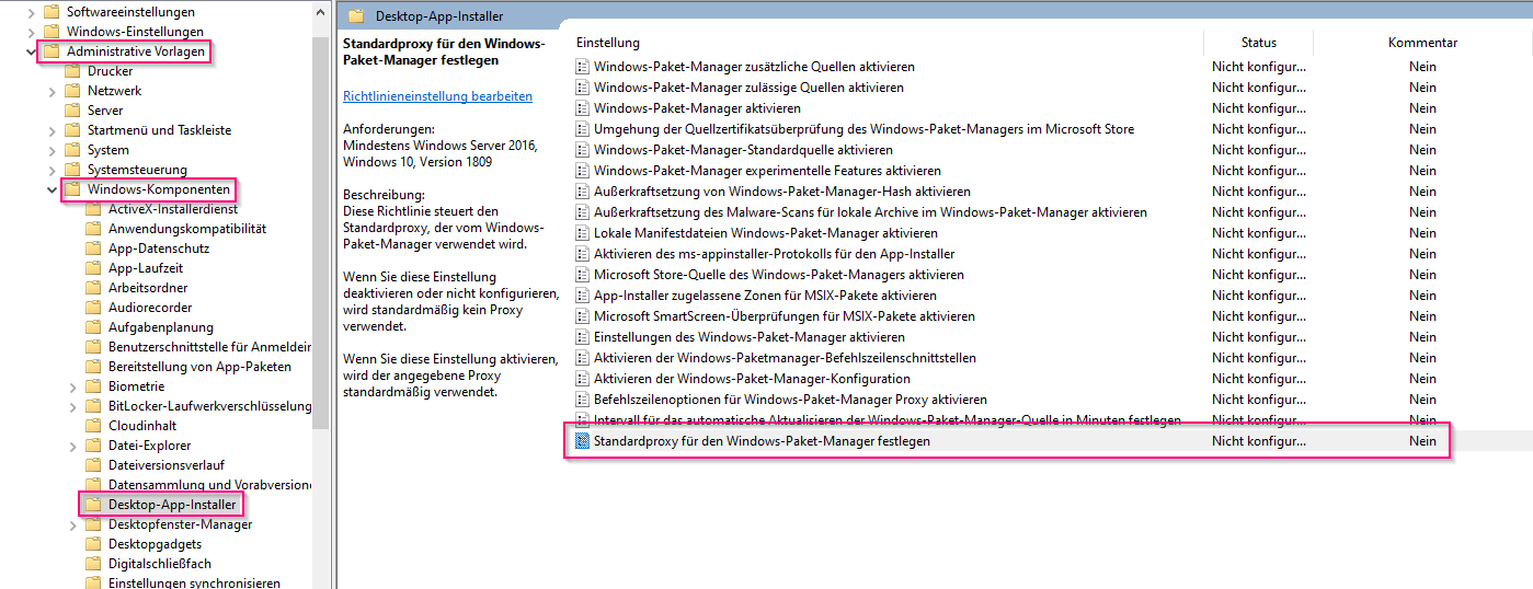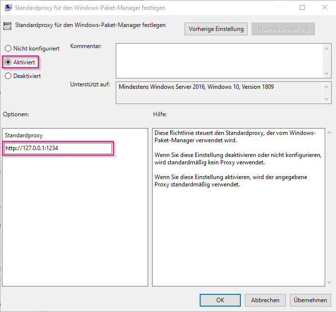 3. Die relevante Richtlinie ist "Standardproxy für den Windows-Paket-Manager festlegen", hier kannst du die entsprechende Adresse und einen Kommentar hinterlegen: