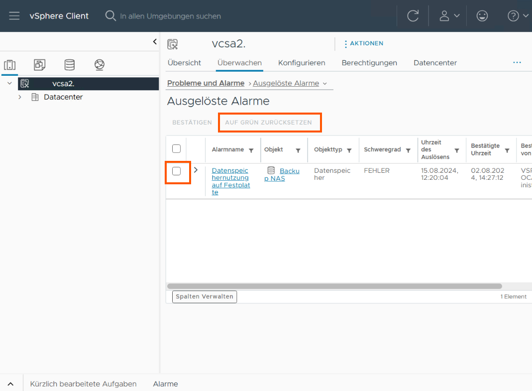 4. In dieser Liste sollte sich die Zertifikatswarnung befinden. Diese dann anhaken und mit "Auf Grün zurücksetzen" bereinigen.